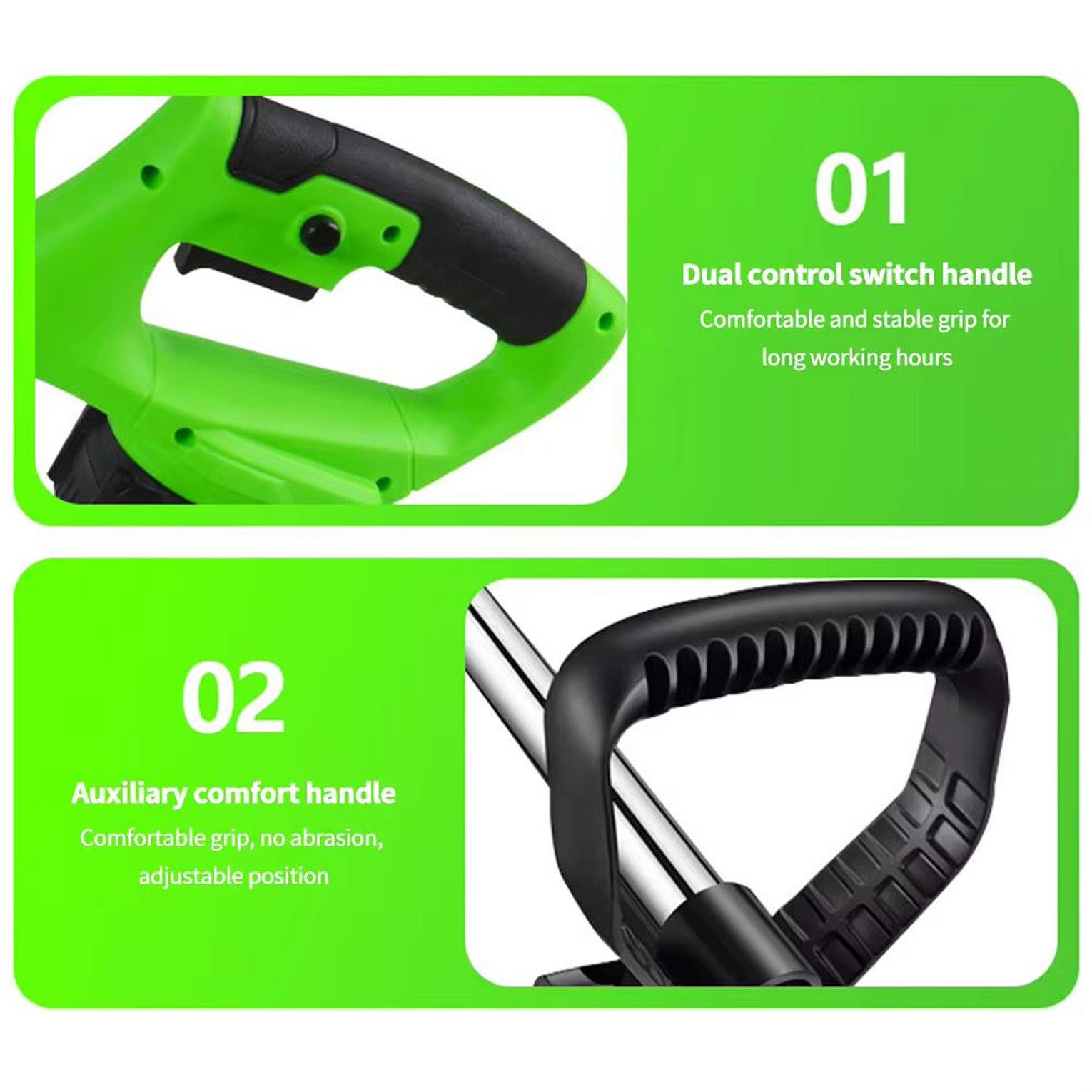 This cordless electric lawn mower and trimmer is ideal for efficient garden pruning and grass cutting. Designed with adjustable height and foldable structure, it offers flexibility and easy storage. Powerful, lightweight and perfect for home gardening.