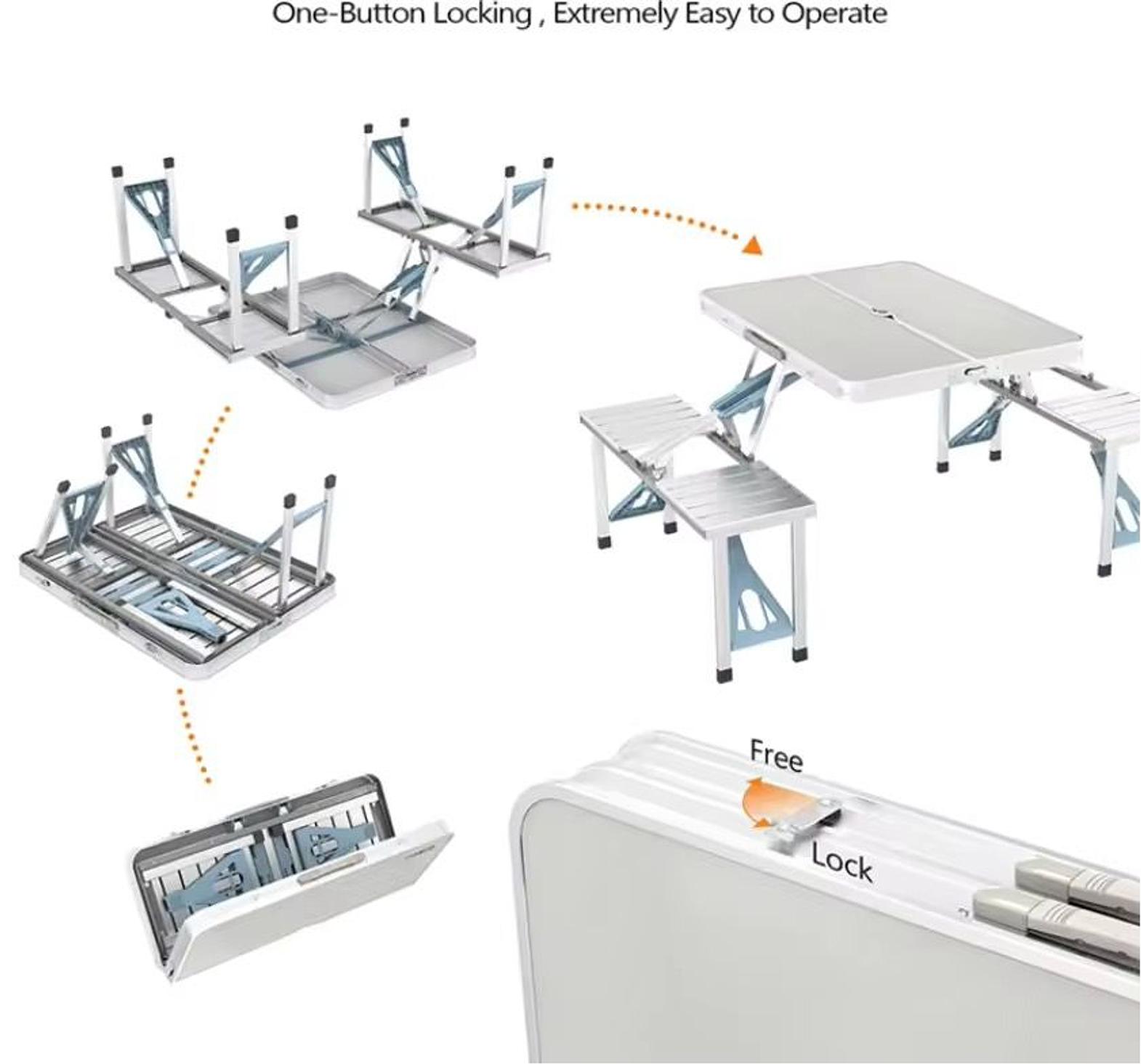 This folding outdoor chair and table set is a lightweight and portable solution for picnics, camping, or outdoor gatherings. Made from durable aluminum alloy, the set includes a table and four comfortable chairs, all designed for easy folding and transport.