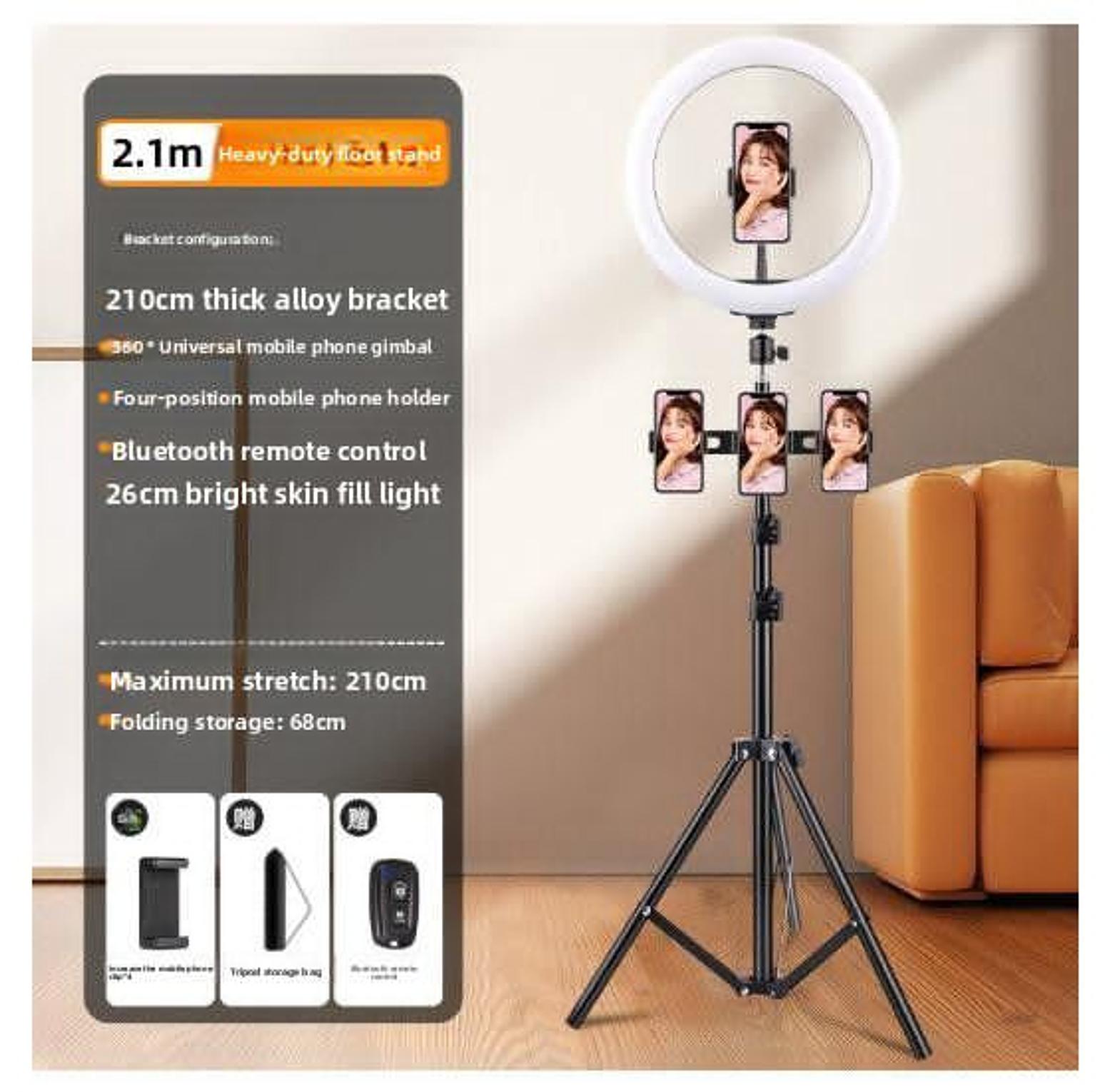 This professional lighting kit is designed to meet the needs of content creators, streamers, makeup artists, and photographers. It features a 210cm heavy-duty thick alloy bracket that provides excellent stability and adjustable height for versatile shooting angles. The setup includes four camera/phone positions, allowing you to mount multiple devices at once for multi-angle recording or live streaming.