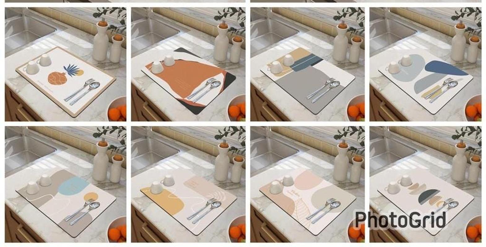 Absorbent dish drying mat designed to protect countertops and allow quick water drainage. Ideal for drying dishes, utensils and glasses while keeping the kitchen clean and dry.