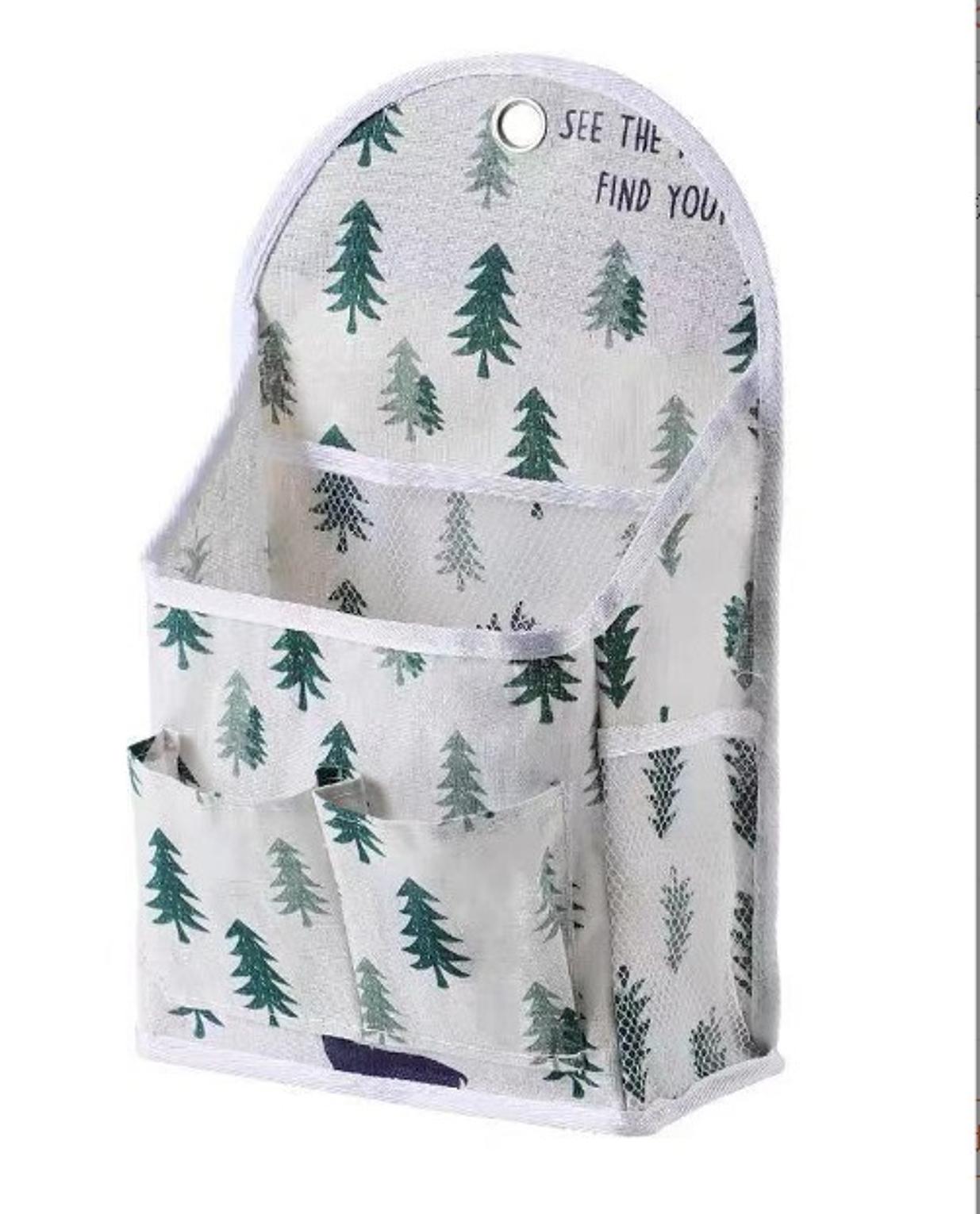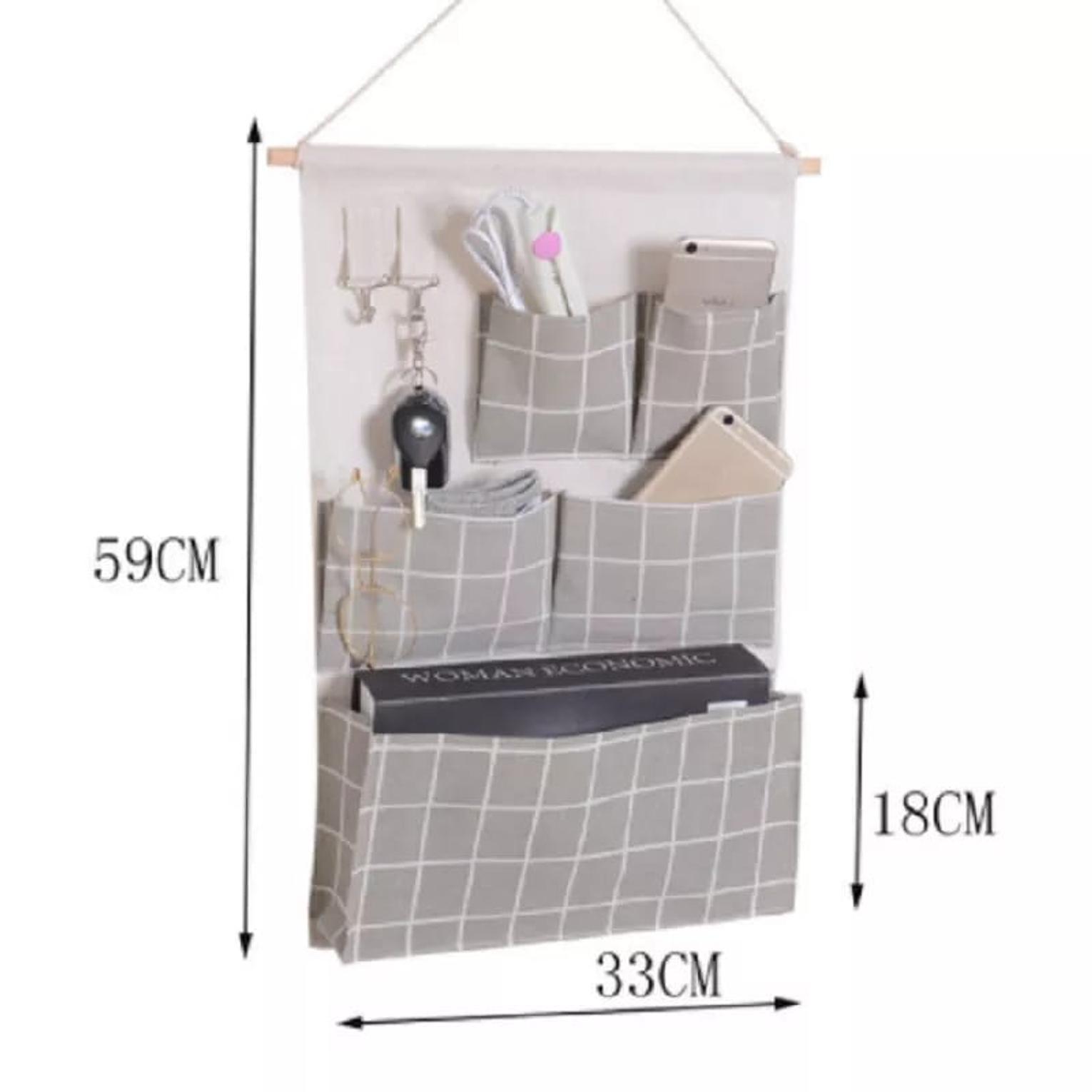 Hanging storage organizer designed to fit over doors for storing magazines, toiletries, accessories, or bathroom items.