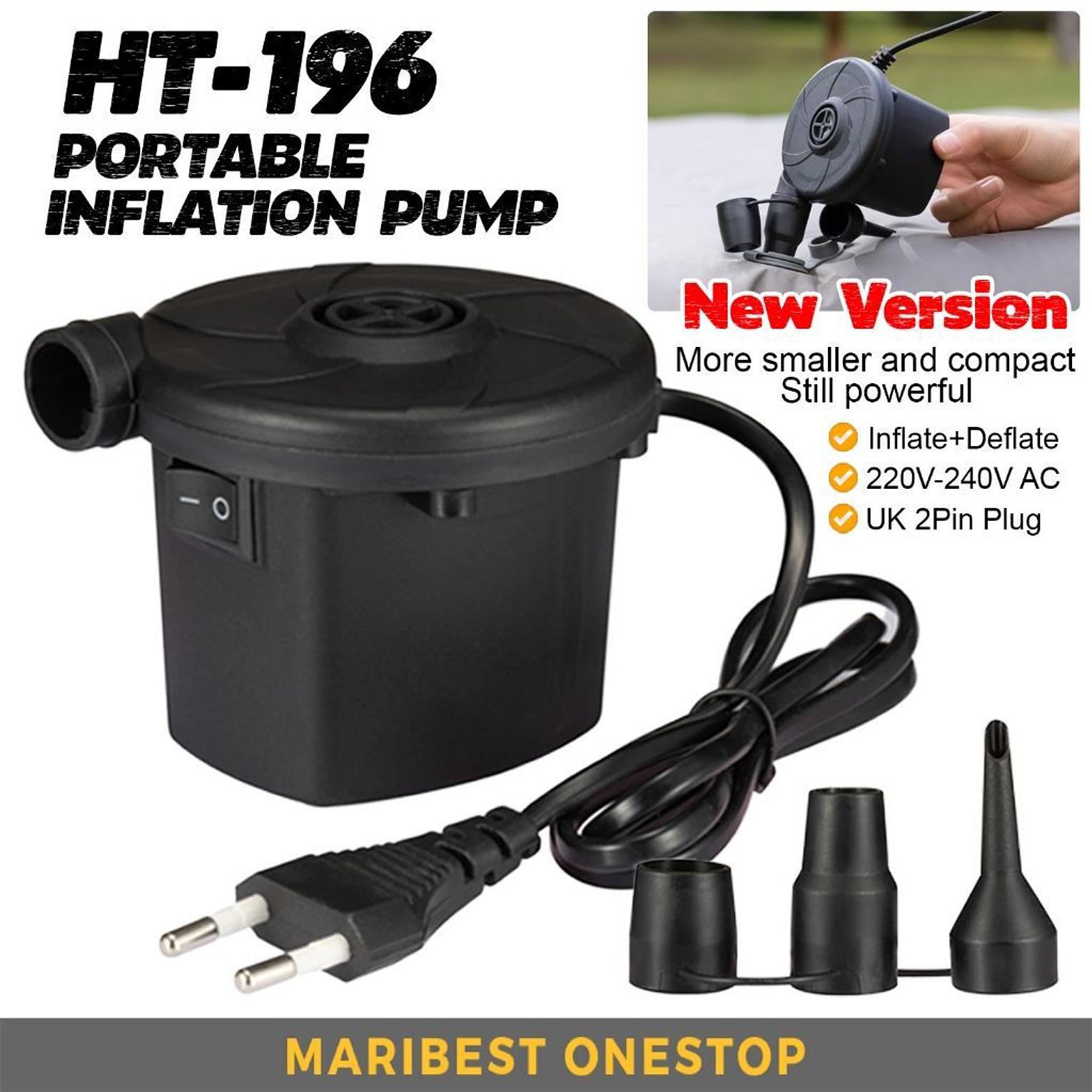 Inflate and deflate effortlessly with the HT-196 Portable Electric Air Pump. Designed for speed and convenience, this compact yet powerful pump is perfect for air mattresses, inflatable pools, floats, toys and more. It features a 220V–240V AC motor and comes with 3 different nozzle sizes to fit multiple valve types. Simple one-switch operation makes it easy for anyone to use.