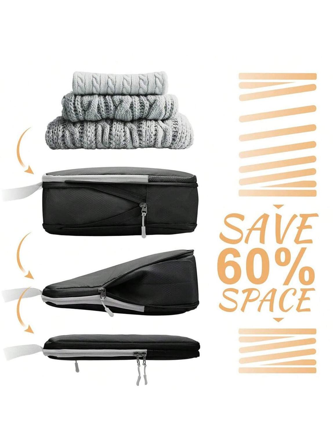 8pcs compressible travel storage bags. Waterproof, space-saving and ideal for organized luggage.