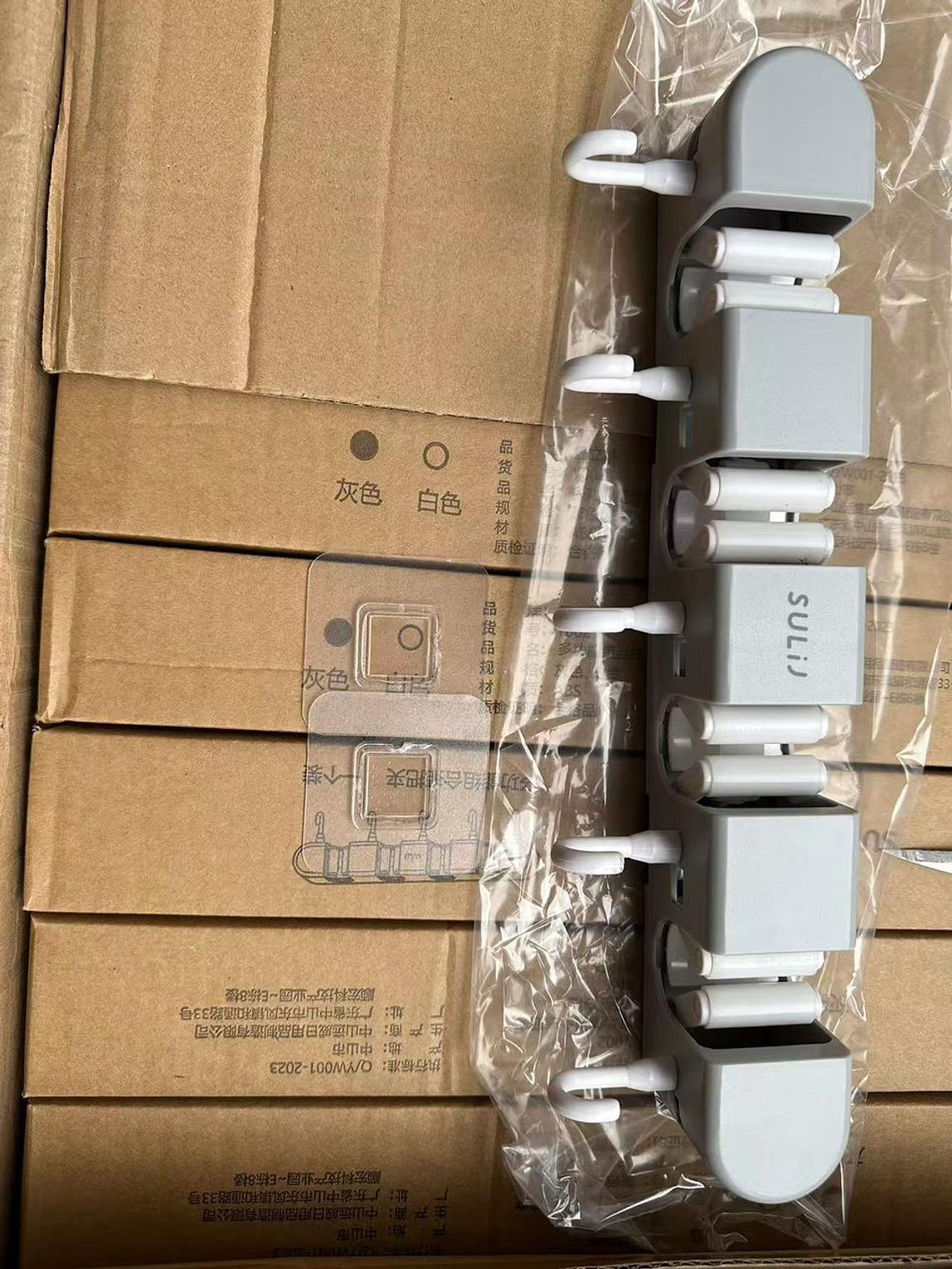 4-hole mop hanger with hooks. Strong adhesive, no drilling needed. Ideal for kitchen and bathroom use.