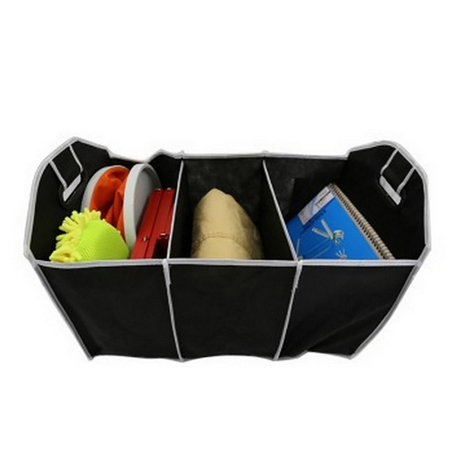 Sturdy foldable car trunk organizer designed to keep groceries, tools, and supplies neatly arranged.