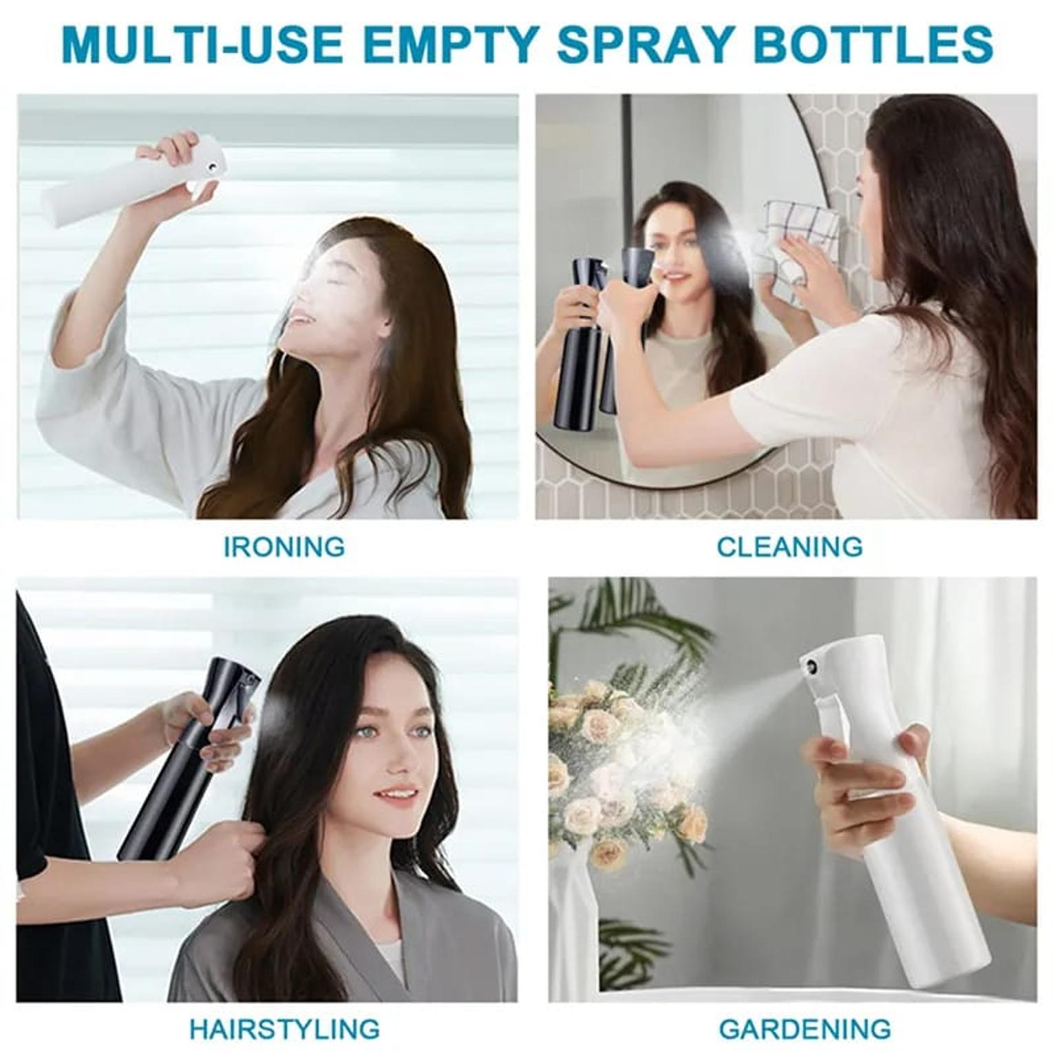 Fine mist spray bottle for hair, plants and cleaning. Available in white or black.