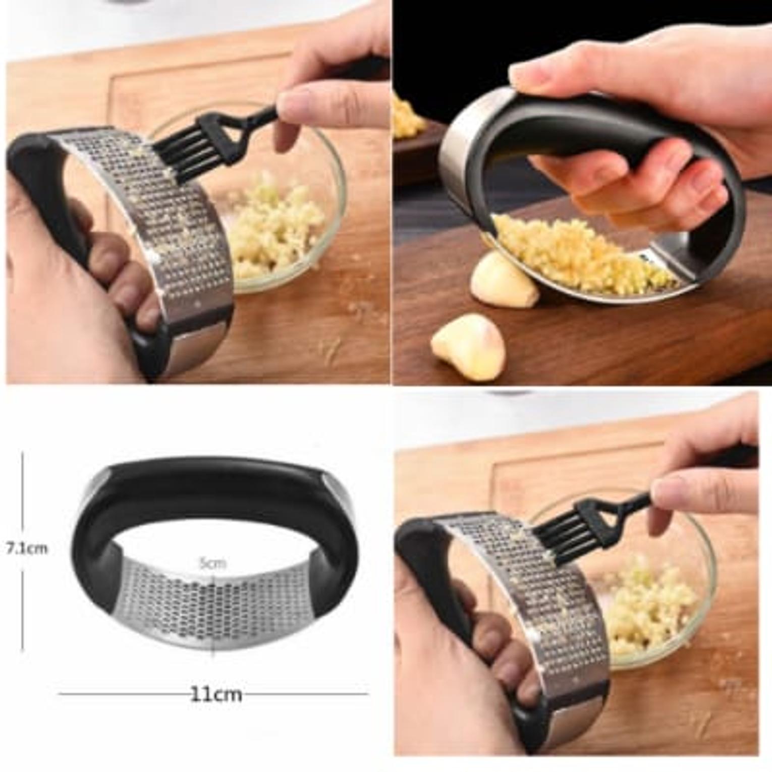 Handheld ring-style garlic crusher for effortless crushing of garlic without mess.