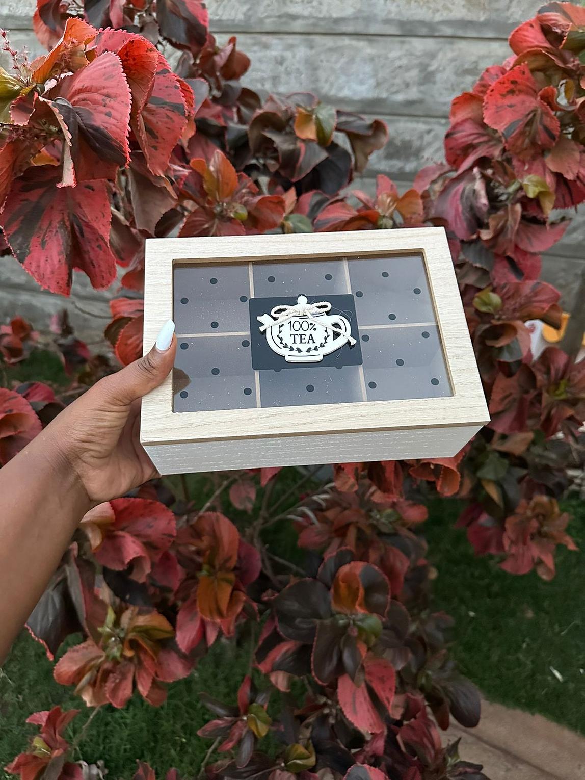 Wooden tea bag holder with glass top.